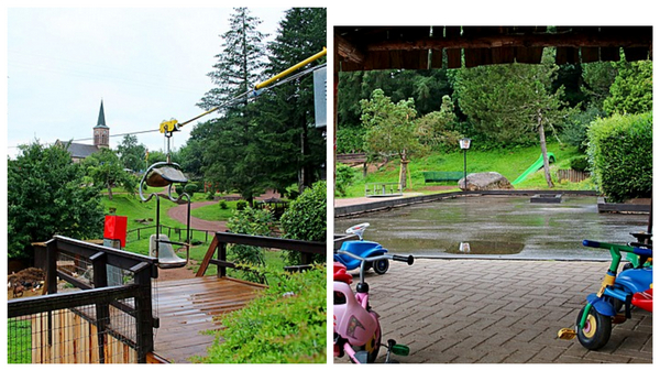 Im oberen Parkbereich gibt es einen weiteren Spielplatz mit Rutschen, Tarzanbahn und für ganz mutige, eine Seilbahn. Für unsere ganz kleinen Gäste haben wir auch eine Bobby Car Bahn. Wer sich an warmen Tagen abkühlen möchte, nicht weit befindet sich die Wassertretanlage mit Kräutergarten.